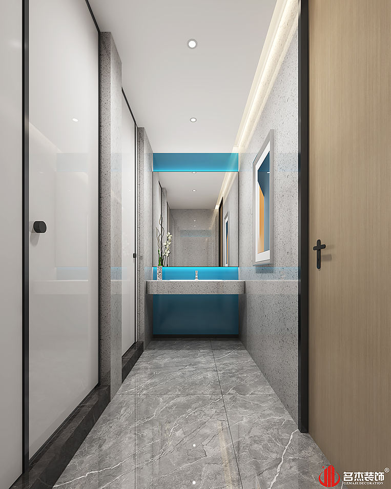 前臺區域利用層高的優勢,搭建出一個大氣且時尚的區域。在背景墻部分加入部分簡約的且不簡單的元素,讓空間變得更加有層次感,土豪金作為空間的點綴色,也為這個前臺區域增加了不少的輕奢感。大部分區域都是做了吊頂的,通過這樣的方式讓整體風格得到了統一,同時這樣簡約的吊頂也能夠給空間帶來不一樣的層次感。空間中藍色點綴也是隨處可見的,能夠很好的感受到企業文化。#工裝裝修#