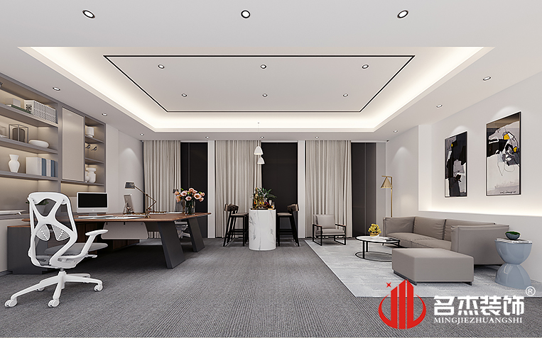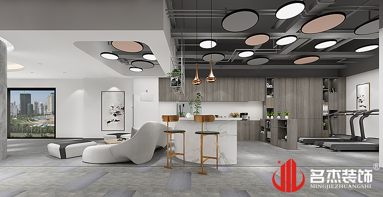整體空間以白灰色調(diào)為主基調(diào),也在前臺區(qū)域增加綠植元素,來體現(xiàn)給產(chǎn)品的綠色環(huán)保,同時也在燈具方面使用圓弧形的吸頂燈,增加整體空間的設(shè)計感,同時綠植元素的加入,也使得綠色環(huán)保的意識加入到空間當(dāng)中。