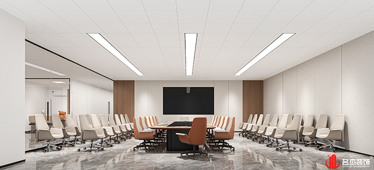 設計團隊根據現場實際情況,定制前臺區域的方式,使用企業LOGO色來作為空間的點綴。河流狀態的橙色造型,寓意著業務川流不息。而在展廳區域則是使用傳統方圓的設計手法,使用灰色的色調搭配流動的燈帶造型,凸顯出該空間的不平凡。#廣州辦公室裝修#