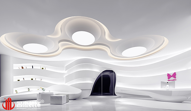 考慮到展廳為主,所以使用大量的弧線來作為整個(gè)辦公室裝修風(fēng)格的主要元素,利用線條和弧線來打造一種流線美的美學(xué),與企業(yè)的核心業(yè)務(wù)美容做一個(gè)呼應(yīng)。