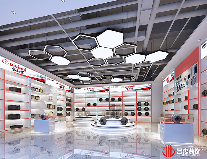 前臺區域加入了很多的弧形元素,為整體的設計感大大提升了好幾個檔次,同時也在部分的柱子上加入企業LOGO色來作為點綴。展廳天花部分則采用蜂巢狀的燈具,表達出一種像蜂群一樣的勤勞工作的寓意。