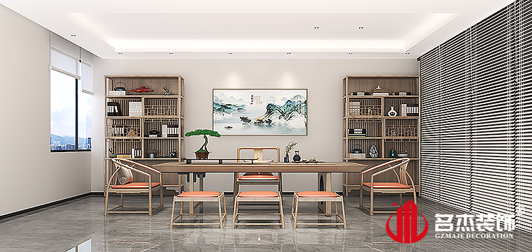在前臺裝修設計方面,利用對稱的方式加上裝飾感強烈的球型燈具,來增強空間的設計感。開放式的展廳設計,加入一些有設計感的燈帶,更加能夠突出展廳的時尚科技感。而在茶室裝修設計方面,則是利用傳統的風格來顯示企業穩重的方面。