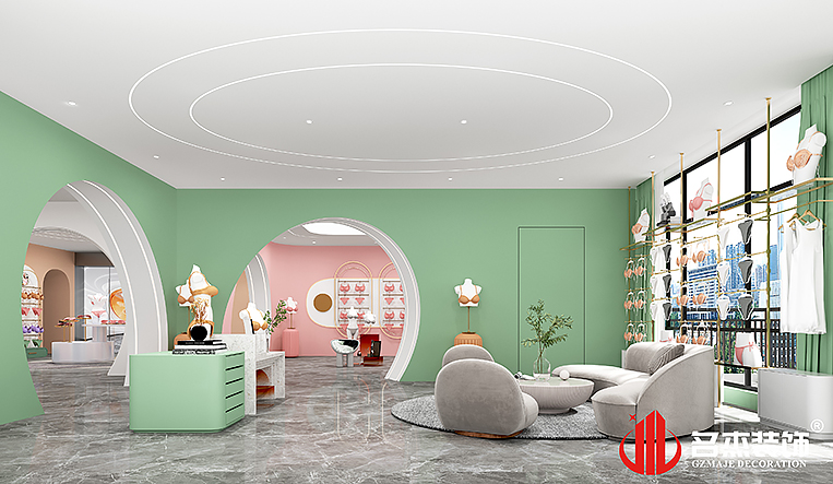 在前臺(tái)區(qū)域使用線條和弧形元素來(lái)增加空間的設(shè)計(jì)層次感,同時(shí)在整體設(shè)計(jì)當(dāng)中加入了莫蘭迪色系作為點(diǎn)綴元素,讓空間的設(shè)計(jì)層次感再次得到提升。不同子品牌采用的是不同的顏色,這樣容易讓大眾更好的識(shí)別,同時(shí)賦予子品牌不一樣的活力,再加上不同于常規(guī)造型的門,突出想要做出別樣的裝修設(shè)計(jì)風(fēng)格。