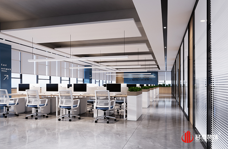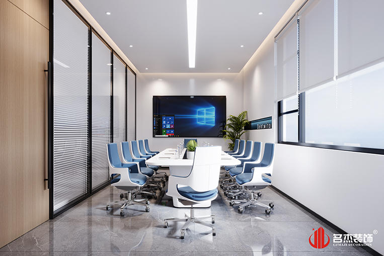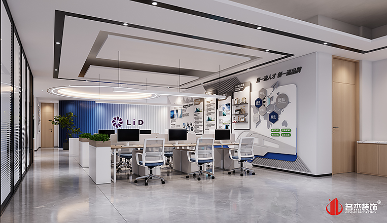 整個辦公裝修設計空間是以時尚簡約的風格來作為主打風格的,加入企業LOGO色——藍色,作為貫穿整個辦公裝修設計空間的點綴色。前廳的背景墻使用的是一種漸變的手法,讓辦公裝修設計空間變得更有設計感,同時在前廳的吊頂使用圓弧的元素,讓辦公裝修設計空間變得更加有層次感。