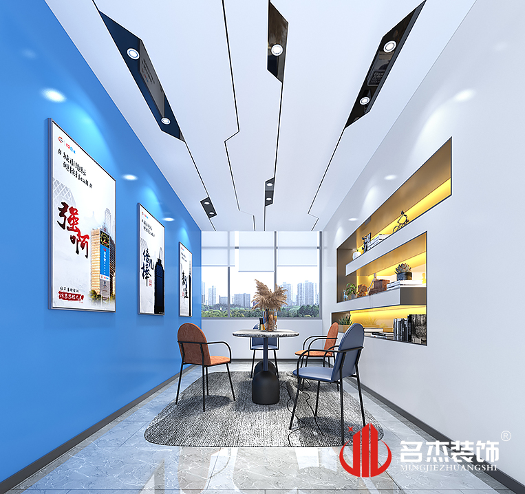 根據客戶的需求,在前臺背景墻上面使了弧形元素和企業logo色相互結合,形成了一種時尚且獨特魅力的風格。而且在多個區域中使用多種造型的燈具,讓辦公室裝修設計空間中的設計感更上一層樓。不同的區域也加入多種色調作為點綴色,也使得空間中的設計感迅速疊滿了。