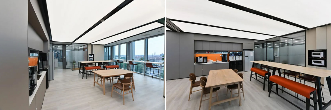 設計團隊特意選擇了一處大型開敞的臨窗場地,在酷炫的3D裸眼展示室旁邊也打造了衣蛾4S店的培訓和茶水間二合一空間,來滿足客戶快速發展的團隊培訓和新品發布,員工活動的需求。臨近建筑幕墻的位置,設計團隊就設計了一派沿窗的休閑階梯造型臺階。員工部分選用了可升降的辦公桌,來滿足員工辦公的個性化需求,白灰色的家具搭配,混搭淺木色的休閑洽談區域,地面則是選用環保地毯來提升空間品質和美感。